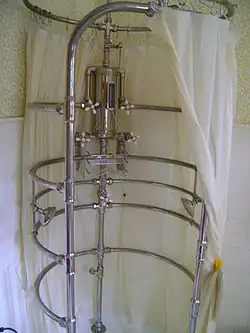 This early start was significantly improved in the anonymously invented English Regency shower design of c. 1810 (there is some ambiguity among the sources).[2] The original design was over 10 ft (3.0 m) tall, and was made of several metal pipes painted to look like bamboo. A basin suspended above the pipes fed water into a nozzle that distributed the water over the user's shoulders. The water on the ground was drained and pumped back through the pipes into the basin, where the cycle would repeat itself. The prototype was steadily improved upon in the following decades until it began to approximate the shower of today in its mode of operation. Hand-pumped models became fashionable at one point, as well as the use of adjustable sprayers for different water flows. The reinvention of reliable indoor plumbing around 1850 allowed free-standing showers to be connected to a running water source, supplying a renewable flow of water.[10] The shower cabin was invented in 1839 by Polish-Canadian politician and engineer Aleksander Edward Kierzkowski.[11]