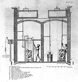 Modern showers were installed in the barracks of the French army in the 1870s as an economic hygiene measure, under the guidance of François Merry Delabost, a French doctor and inventor.[12] As surgeon-general at Bonne Nouvelle prison in Rouen, Delabost had previously replaced individual baths with mandatory communal showers for use by prisoners, arguing that they were more economical and hygienic.[13] First six, then eight shower stalls were installed. A steam engine heated the water, and in less than five minutes, up to eight prisoners could wash simultaneously with only twenty litres of water. The French system of communal showers was adopted by other armies, the first being that of Prussia in 1879, and by prisons in other jurisdictions. They were also adopted by boarding schools before being installed in public bathhouses. The first shower in a public bathhouse was in 1887 in Vienna. In France, public bathhouses and showers were established by Charles Cazalet, firstly in Bordeaux in 1893 and then in Paris in 1899.[14]
