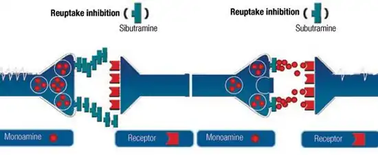 Sibutramine is a serotonin–norepinephrine reuptake inhibitor (SNRI) that, in humans, reduces the reuptake of norepinephrine (by ~73%), serotonin (by ~54%), and dopamine (by ~16%),[23] thereby increasing the levels of these substances in synaptic clefts and helping enhance satiety; the serotonergic action, in particular, is thought to influence appetite. Older anorectic agents such as amphetamine and fenfluramine force the release of these neurotransmitters rather than affecting their reuptake.[24]