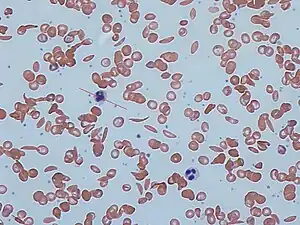 | Sickle cells in human blood: both normal red blood cells and sickle-shaped cells are present | |