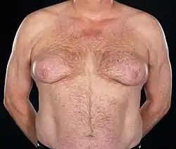 In more than 90% of affected men, bicalutamide-related breast changes are mild-to-moderate in severity.[9][35][34] It is only rarely and in severe and extreme cases of gynecomastia that the proportions of the male breasts become so marked that they are comparable to those of women.[36] In addition, bicalutamide-associated breast changes improve or resolve in most men upon discontinuation of therapy.[9] In the EPC trial, 16.8% of bicalutamide patients relative to 0.7% of controls withdrew from the study due to breast pain and/or gynecomastia.[35][34] Gynecomastia and breast pain improved or resolved upon discontinuation in 70 and 90% of patients, respectively.[34] Resolution of breast symptoms was dependent on duration of bicalutamide therapy, with resolution rates ranging from 29% with >18 months of treatment to 64% for <6 months of treatment.[34]