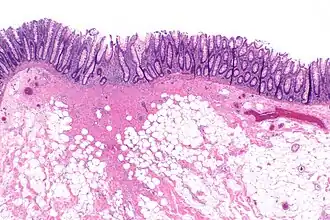 ![]() Micrograph showing a colorectal polypectomy scar. H&E stain. | |
