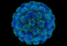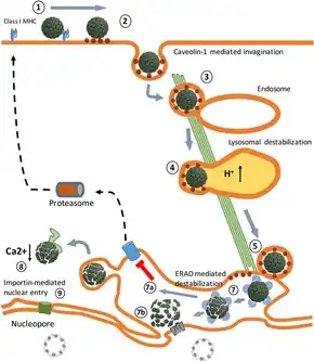 SV40 consists of an unenveloped icosahedral virion with a closed circular double-stranded DNA genome[4] of 5.2 kb.[5] The virion adheres to cell surface receptors of MHC class I by the virion glycoprotein VP1. Penetration into the cell is through a caveolin vesicle. Inside the cell nucleus, the cellular RNA polymerase II acts to promote early gene expression. This results in an mRNA that is spliced into two segments. The small and large T antigens result from this. The large T antigen has two functions: 5% goes to the plasma cell membrane and 95% returns to the nucleus. Once in the nucleus the large T antigen binds three viral DNA sites, I, II and III. Binding of sites I and II autoregulates early RNA synthesis. Binding to site II takes place in each cell cycle. Binding site I initiates DNA replication at the origin of replication. Early transcription gives two spliced RNAs that are both 19s. Late transcription gives both a longer 16s, which synthesizes the major viral capsid protein VP1; and the smaller 19s, which gives VP2 and VP3 through leaky scanning. All of the proteins, besides the 5% of large T, return to the nucleus because assembly of the viral particle happens there. A putative late protein VP4 has been reported to act as a viroporin facilitiating release of viral particles and resulting in cytolysis;[6][7] however the presence and role of VP4 have been disputed.[8][9]