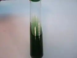 Although it could be used in other formats (e.g., Petri plates), Simmons' citrate agar is often used in slants or slopes in test tubes. One advantage of using slants over Petri dishes is access to oxygen, which is required by citrate metabolism. Simmons’ agar can be bought from suppliers as ready-made powders or slants. A slant is prepared by adding the heated agar to a test tube and allowing it to solidify at a slanted angle. To transfer cells from a sample to the agar, a sterilized needle is used to select a distinct colony from the sample and to streak across the agar surface, as is done on an agar plate. It is important to prepare a light cell inoculum because carry-over of nutrients[9] or dead bacterial cell matter containing carbon and nitrogen from the inoculum might produce false positive results.[4] Using a needle to transfer a cell sample can reduce carrying over extra inoculum.[3]