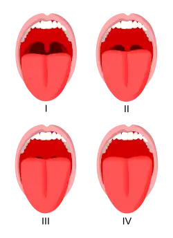 - Mouth opening: A mouth opening greater than 4 centimeters between the incisors results in 0 points whereas a distance below results in 1 point.