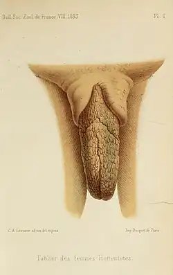 2. Pieterse, Jan Nederveen (1992). White on Black: Images of Africa and Blacks in Western Popular Culture. Yale University Press. p. 180. ISBN 9780300063110. "The Female Hottentot, with natural Apron." The "Hottentot apron", a late-eighteenth and early-nineteenth-century medical myth of grossly overdeveloped labia, is here represented as fact. (Lithograph by J. Pafs, Great Britain, 1795)