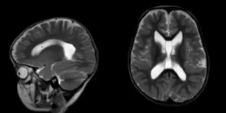 Seizure disorders are common,[3] and may include generalized tonic–clonic, absence, rolandic and febrile seizures.[4] Neuroimaging usually reveals benign brain anomalies.[5] Other neurodevelopmental findings include mildly decreased muscle tone, poor motor coordination and unusual walking. Feeding difficulties—made worse by decreased tone of muscles—begin in infancy and may lead to failure to thrive.[6] Children can also experience reflux and constipation.[7] Heart defects such as ventricular septal defect and lung conditions like tracheomalacia occur rarely.[1]