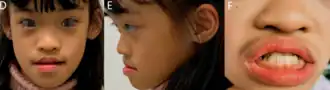 Individuals with Skraban–Deardorff syndrome frequently present with distinct facial dysmorphisms. Common features include a coarse facial appearance, broad nasal tip, prominent maxilla, flat Cupid's bow, wide mouth, widely spaced teeth and gingival enlargement. Findings seen less often include microcephaly, cleft palate, short philtrum, pointed chin, small jaw and tapering eyebrows on the sides. The eyes often appear large due to prominent eyebrows and large-appearing irides. Ocular abnormalities such as eye misalignment, lazy eye, near or far-sightedness may also be present. Skeletal findings have been observed in only a few individuals, and have included mild lower limb contractures, high arch of foot, forefoot varus, hip dysplasia and osteopathia striata.[1][2]