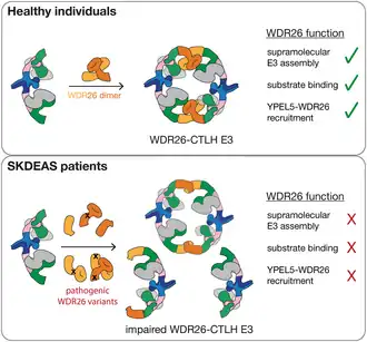 - 1 2 Gross, Annette; et al. (2024-04-04). Griesinger, Christian (ed.). "Skraban–Deardorff intellectual disability syndrome-associated mutations in WDR26 impair CTLH E3 complex assembly". FEBS Letters. 598 (9). Cambridge, England: Federation of European Biochemical Societies: 978–994. doi:10.1002/1873-3468.14866. ISSN 1873-3468. PMC 7616460. PMID 38575527.