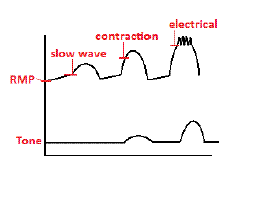 A depiction of a slow wave, contraction and electrical threshold in relation to smooth muscle tone and resting membrane potential.