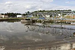 Sludge (possibly from Middle English slutch 'mud, mire', or some dialect related to slush)[1] is a semi-solid slurry that can be produced from a range of industrial processes, from water treatment, wastewater treatment or on-site sanitation systems. It can be produced as a settled suspension obtained from conventional drinking water treatment,[2] as sewage sludge from wastewater treatment processes[3]: 23–25 or as fecal sludge from pit latrines and septic tanks. The term is also sometimes used as a generic term for solids separated from suspension in a liquid; this soupy material usually contains significant quantities of interstitial water (between the solid particles). Sludge can consist of a variety of particles, such as animal manure.[4]