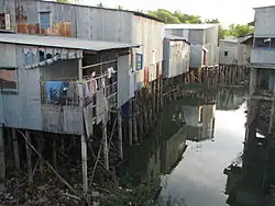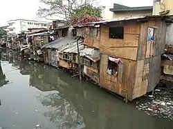 Although slums are usually located in urban areas, they can be located in suburban areas where housing quality is low and living conditions are poor.[2] Slum residences vary from shanty houses to professionally built dwellings which, because of poor-quality construction or lack of basic maintenance, have deteriorated.[3] While slums differ in size and other characteristics, most lack reliable sanitation services, supply of clean water, reliable electricity, law enforcement, and other basic services. The United Nations defines slums as ".... informal settlements lacking one or more of the following conditions: access to improved water, access to improved sanitation, sufficient living area, housing durability, and security of tenure."[4]