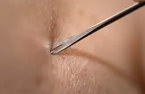 The current formulation of smallpox vaccine is a live virus preparation of infectious vaccinia virus. The vaccine is given using a bifurcated (two-pronged) needle that is dipped into the vaccine solution. The needle is used to prick the skin (usually the upper arm) a number of times in a few seconds. If successful, a red and itchy bump develops at the vaccine site in three or four days. In the first week, the bump becomes a large blister (called a "Jennerian vesicle") which fills with pus, and begins to drain. During the second week, the blister begins to dry up and a scab forms. The scab falls off in the third week, leaving a small scar.[55]