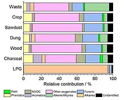 Wood smoke is a major source of air pollution,[33][34][35][36] especially particulate pollution,[34] pollution by polycyclic aromatic hydrocarbons (PAHs)[37] and volatile organic compounds (VOCs)[34] such as formaldehyde.[38]