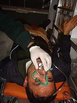 | A patient being treated for smoke inhalation in an ambulance by the Palestine Red Crescent Society in Jabaliya during the First Gaza War | |