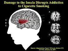 - ↑ Naqvi NH, Rudrauf D, Damasio H, Bechara A (January 2007). "Damage to the insula disrupts addiction to cigarette smoking". Science. 315 (5811): 531–534. Bibcode:2007Sci...315..531N. doi:10.1126/science.1135926. PMC 3698854. PMID 17255515.