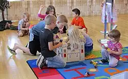 Play is a central building block to children's development, so much so that the United Nations Commission on Human Rights has declared it to be a human right of all children.[18] The complexity and diversity of play increases immensely in the preschool years, most notably with the onset of cooperative play, where children work toward a common goal, and socio-dramatic play (a type of cooperative play), where children act out make believe scenes.[6] Socio-dramatic play is rooted in the child's real-life experiences, falling into three categories: family scenes (e.g., "playing house" with assigned mommy and daddy roles), character scenes (e.g., being a superhero, or a princess), and functional scenes (e.g., playing doctor).[19] Cooperative play and socio-dramatic play both bring about increased social interactions, as compared to solitary play and parallel play, where children play similarly next to each other without significant interaction (e.g., two children building their own towers). It is here where play becomes intertwined with social emotional development. The characteristics of socio-dramatic play allow children to practice cooperation, negotiation, and conflict resolution skills, as well as engage in role-playing that promotes perspective taking. As such, socio-dramatic play has been associated with all of these social emotional skills in children.[19]