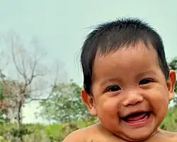 Beginning at birth, newborns have the capacity to signal generalized distress in response to unpleasant stimuli and bodily states, such as pain, hunger, body temperature, and stimulation.[6] They may smile, seemingly involuntarily, when satiated, in their sleep, or in response to pleasant touch. Infants begin using a “social smile,” or a smile in response to a positive social interaction, at approximately 2 to 3 months of age, and laughter begins at 3 to 4 months.[6] Expressions of happiness become more intentional with age, with young children interrupting their actions to smile or express happiness to nearby adults at 8–10 months of age, and with markedly different kinds of smiles (e.g., grin, muted smile, mouth open smile) developing at 10 to 12 months of age.[6]