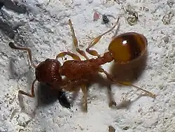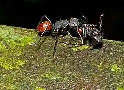A giant ant (Camponotus gigas) carrying a dead conspecific - The corpses of group members killed by an infectious disease present a serious hazard to colony health (as in natural environments death from disease is much more common than death from old age): one mechanism that has evolved to help neutralize this risk is necrophoresis, the removal of corpses from the nest by workers.[21] 'Refuse piles' or 'graveyards' are common features of ant colonies, and workers remove corpses (within the hour after death) to these piles after detecting death signatures in the cuticular hydrocarbon chemistry.[22][23] Corpse deposition is biased towards downward slopes, which saves the corpse-transporting worker energy as well as preventing any rain washing the corpses back into the colony - necrophoretic behaviours are distinct from ant responses to foreign inanimate objects as corpses are transported further and quicker.[22][24] By bringing corpses out of the nest the ultraviolet radiation in sunlight can kill emerging fungal spores;[24] Atta transport corpses to special refuse chambers rather than into the external environment. Temnothorax lichtensteini ants remove the corpses of dead sisters as above, but bury newly-dead foreign corpses inside the nest - whilst one or a few individuals 'decide' to transport or bury a corpse, up to 25 workers are then involved in the undertaking of one corpse.[25] Termites commonly bury and cannibalize corpses:[24] when C. formosanus colonies are infected with M. anisopliae, necrophagy is common when the proportion of dead individuals in an area was low (15%), but as mortality increased then so did burying behaviour up to 75%–80% mortality above which carcasses were too numerous for workers to bury and secondary rounds of M. anisopliae infection was possible.[26] Termites do occasionally remove dead from the nest but this is uncommon (leaving the nest at all is rare); refuse chambers or piles/graveyards have not been observed.[24] Research on undertaking behaviours in bees has concentrated on the honeybee (Apis mellifera): 1–2% of a colony are undertaker bees, specialized for corpse removal: they inspect corpses with their antennae before rapidly dropping them from the nest.[24][27]