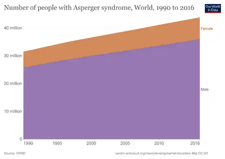 Historically, autism was thought of as a condition mostly affecting males. Some studies found that males were up to four times more likely than females to be diagnosed as autistic[33] and among those with Asperger syndrome or "high-functioning autism", males were up to ten times more likely to be diagnosed.[34] This may be due to the fact that many of the diagnostic tools used to diagnose autism have been crafted through the observation of males on the autism spectrum and are therefore more likely to identify men and boys with autism than their female counterparts.[35][36] To date, the research and support surrounding autistic people has been male-centric; women and non-binary people are seriously underrepresented.[37]