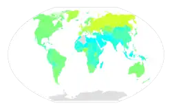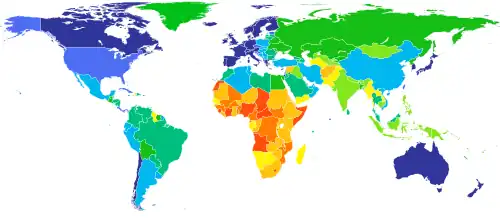 North America is a fairly recent settled continent, made up of the United States, Canada, Mexico, Central America, and the Caribbean. It was built by an amalgamation of wealth, ideas, culture, and practices. North America is highly advanced intellectually, technologically, and traditionally. This advantageous character of North American nations has caused a high average life expectancy of 75 years for males and 80 years for females. This leads to the conclusion that North America has cultivated a comparatively healthy society. As North America contains several core nations, the growing economies in those nations are able to maintain and develop medical institutions. This subsequently provides more access to health care for American citizens but health care is not universal. North America is known for being a leading nation in regards to industrialization and modernization, but the United States lacks federal laws regarding health care as a basic human right. This lag of health care security causes subsequent issues with pharmaceutical competition, lack of care for the elderly, and little attention to alternative medicine.[35] Health care and education are plentiful at a price and illness still persists for multiple reasons.[36] A main reason is that a lower- and middle-class population still exists in plentiful numbers, maintaining a group that is highly vulnerable to physical ailment.