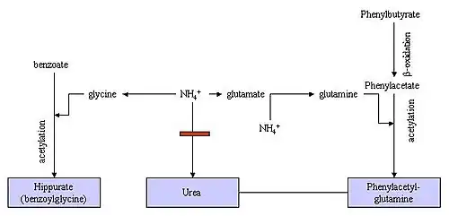 Sodium phenylbutyrate is taken orally or by nasogastric intubation as a tablet or powder, and tastes very salty and bitter. It treats urea cycle disorders, genetic diseases in which nitrogen waste builds up in the blood plasma as ammonia glutamine (a state called hyperammonemia) due to deficiences in the enzymes carbamoyl phosphate synthetase I, ornithine transcarbamylase, or argininosuccinic acid synthetase.[8][4] Uncontrolled, this causes intellectual impairment and early death.[4] Sodium phenylbutyrate metabolites allows the kidneys to excrete excess nitrogen in place of urea, and coupled with dialysis, amino acid supplements and a protein-restricted diet, children born with urea cycle disorders can usually survive beyond 12 months.[4] Patients may need treatment for all their life.[4] The treatment was introduced by researchers in the 1990s, and approved by the U.S. Food and Drugs Administration (FDA) in April 1996.[10][11]