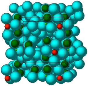 ![]() Crystal structure of ZS-9. Blue spheres = oxygen atoms, red spheres = zirconium atoms, green spheres = silicon atoms. | |