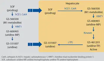 Sofosbuvir is activated in the liver to the triphosphate GS-461203 by hydrolysis of the carboxylate ester by either of the enzymes cathepsin A or carboxylesterase 1, followed by cleaving of the phosphoramidate by the enzyme histidine triad nucleotide-binding protein 1 (HINT1), and subsequent repeated phosphorylation.[35] Dephosphorylation creates the inactive metabolite GS-331077. The half life of sofosbuvir is 0.4 hours, and the half life of GS-331077 is 27 hours.[10]