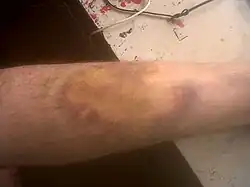 A medical professional should evaluate painful injuries and changes in soft tissue function.[7] To make a full diagnosis, they may use nerve conduction studies to localize nerve dysfunction (e.g. carpal tunnel syndrome), assess severity, and help with prognosis. Electrodiagnosis also helps differentiate between myopathy and neuropathy. Magnetic resonance imaging is most commonly used to evaluate soft tissue injuries that may require surgical repair. Immediately following injury, the damaged tissue is often cooled, with some people choosing to continue cooling as a regular part of healing. In recent years, the use of cryotherapy in soft tissue injury management has been challenged extensively.[8][9] Cooling minimizes the inflammatory process and edema, which is believed to help one recover from a soft-tissue injury.[10] However, prolonged usage of cooling slows healing in animal models.[11] Instead, cooling should be restricted to within 24-48 hours of the injury.[12] However, creatine kinase-MB isoform and myoglobin levels circulating in the blood are increased after exercising. Excessive cooling may impede the recovery process by keeping the Creatine kinase-MB isoform and myoglobin levels increased 2–3 days post exercise.[13] When possible, the affected limb is elevated above the level of the heart, and is compressed using adhesive tape. Evidence supporting elevation and compression is weak, but continues to be widely practiced.[14]