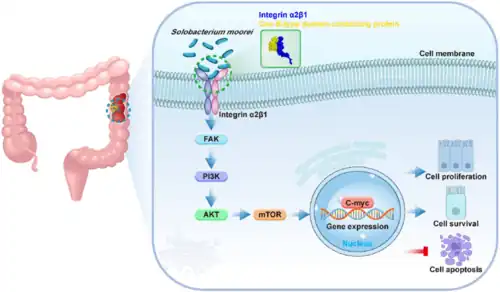 Solobacterium moorei attached to HT-29 colorectal cancer cells and stimulated cell proliferation.[16] This bacteria promotes colorectal cancer growth by binding to integrin α2 and integrin β1 on tumor cells through its Cna B-type domain-containing protein.[17] This activates the PI3K-AKT-mTOR-C-myc signaling pathway via phosphorylated Focal Adhesion Kinase (phospho-FAK), leading to tumor progression due to promotion of cell survival and reduction of cell apoptosis.[17] Small interfering RNA (siRNA) was used to silence the genes integrin α2 and integrin β1, reducing the expression of the integrin subunits.[17] Blocking integrin α2/β1 stopped S. moorei's cancer-promoting effects in lab and mice studies.[17]