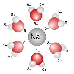 A classic example is when water molecules arrange around a metal ion. If the metal ion is a cation, the electronegative oxygen atom of the water molecule would be attracted electrostatically to the positive charge on the metal ion. The result is a solvation shell of water molecules that surround the ion. This shell can be several molecules thick, dependent upon the charge of the ion, its distribution and spatial dimensions.