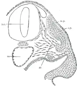 ![]() Transverse section of half of a chick embryo of forty-five hours' incubation. The dorsal (back) surface of the embryo is towards the top of this page, while the ventral (front) surface is towards the bottom. | |