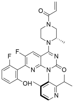 It selectively forms an irreversible covalent bond to the sulfur atom in the cysteine residue that is present in the mutated form of KRAS, but not in the normal form.[10]