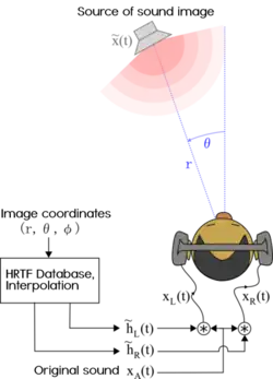 This kind of sound localization technique provides us the real virtual stereo system.[26] It utilizes "smart" manikins, such as KEMAR, to glean signals or use DSP methods to simulate the transmission process from sources to ears. After amplifying, recording and transmitting, the two channels of received signals will be reproduced through earphones or speakers. This localization approach uses electroacoustic methods to obtain the spatial information of the original sound field by transferring the listener's auditory apparatus to the original sound field. The most considerable advantages of it would be that its acoustic images are lively and natural. Also, it only needs two independent transmitted signals to reproduce the acoustic image of a 3D system.