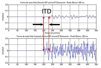 • Interaural time difference (ITD) – Sound from the right side reaches the right ear earlier than the left ear. The auditory system evaluates interaural time differences from: (a) Phase delays at low frequencies and (b) group delays at high frequencies.