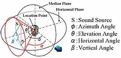 Localization can be described in terms of three-dimensional position: the azimuth or horizontal angle, the elevation or vertical angle, and the distance (for static sounds) or velocity (for moving sounds).[6]