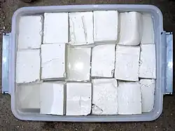 | Blocks of tofu, prepared by coagulating soy milk and then pressing to remove excess water | |