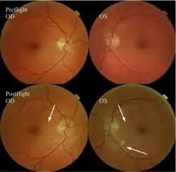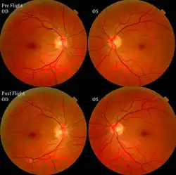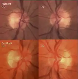 NASA has reported that fifteen long-duration male astronauts (45–55 years of age) have experienced confirmed visual and anatomical changes during or after long-duration flights.[5] Optic disc edema, globe flattening, choroidal folds, hyperopic shifts and an increased intracranial pressure have been documented in these astronauts. Some individuals experienced transient changes post-flight while others have reported persistent changes with varying degrees of severity.[6]