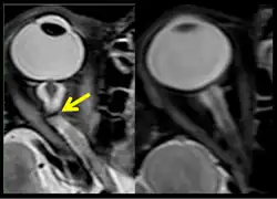 Figure 11: MRI (R+30 days) of the fourth case of visual changes from long-duration spaceflight. Tortuous optic nerve and kink on left (arrow). Control orbit on the right.