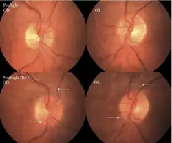 28. Dickerman, RD; Smith, GH; Langham-Roof, L; McConathy, WJ; East, JW; Smith, AB (April 1999). "Intra-ocular pressure changes during maximal isometric contraction: does this reflect intra-cranial pressure or retinal venous pressure?". Neurological Research. 21 (3): 243–6. doi:10.1080/01616412.1999.11740925. PMID 10319330.