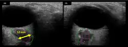 Figure 6: On-orbit ultrasound of optic nerves of the fourth case of visual changes from long-duration spaceflight. In-flight ultrasound shows proximal kinking and increased optic nerve sheath diameter (ONSD) of approximately 12 mm that is consistent with raised ICPs. Optic nerve shown in purple and the ONSD in green.