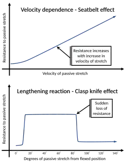 Another characteristic of spasticity, which may be referred to as "seatbelt effect" of spasticity, is different as the amount of resistance offered by the muscle is directly proportional to velocity of the passive movement.[11] It is caused by increased muscle spindle excitability and velocity sensitivity of Ia spindle afferent nerve fibres, resulting in excessive activation of alpha motor neurons of the spinal cord.[12] It is similar to the tug we feel initially while pulling the seatbelt of a car beyond a certain velocity, hence the name "seatbelt effect"[10]