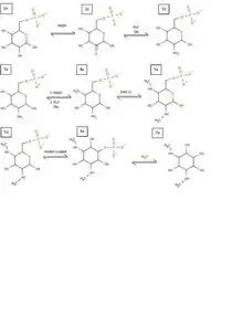 While all this happens, an alternate pathway is occurring creating the sugar functional group from a similar starting product. In this pathway, glucose-1-phosphate is used as the starting product (1b). This is converted into a TDP glucose through TDP synthase (2b). TDP glucose then has the hydroxyl removed from C6 through a hydratase enzyme (3b), which is then reduced through NADH at C4 creating a new product (4b). With this ketone present, PLP and glutamine can come in to convert it to a primary amine (5b) which can then be removed through a deaminase (6b). This conversion to 6b is also accompanied by a double reduction at C4 and C3 through two more NADH molecules, giving the final product necessary to form the aminoglycoside. With this, products 7a and 6b can come together, removing the TDP functional group and combining with the sugar molecule to form the aminoglycoside spectinomycin.[9]