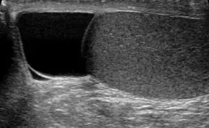 | Ultrasound of a testicle (grey) and a spermatocele (black). | |