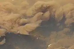 | Submerged S. natans colonies with floating insect in the lower right for scale. Beige color shown is typical of aerated sewage treatment plants, but color may vary through grey toward black downstream of septic sewage or into brighter orange from precipitated red iron oxide. | |
