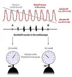 By observing the mercury in the column, or the aneroid gauge pointer, while releasing the air pressure with a control valve, the operator notes the values of the blood pressure in mmHg. The peak pressure in the arteries during the cardiac cycle is the systolic pressure, and the lowest pressure (at the resting phase of the cardiac cycle) is the diastolic pressure. A stethoscope, applied lightly over the artery being measured, is used in the auscultatory method. Systolic pressure (first phase) is identified with the first of the continuous Korotkoff sounds. Diastolic pressure is identified at the moment the Korotkoff sounds disappear (fifth phase).