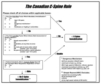 18. Michaleff, ZA; Maher, CG; Verhagen, AP; Rebbeck, T; Lin, CW (6 November 2012). "Accuracy of the Canadian C-spine rule and NEXUS to screen for clinically important cervical spine injury in patients following blunt trauma: a systematic review". Canadian Medical Association Journal. 184 (16): E867-76. doi:10.1503/cmaj.120675. PMC 3494329. PMID 23048086.