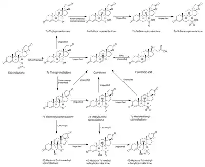- ↑ Overdiek HW, Merkus FW (1987). "The metabolism and biopharmaceutics of spironolactone in man". Rev Drug Metab Drug Interact. 5 (4): 273–302. doi:10.1515/DMDI.1987.5.4.273. PMID 3333882.