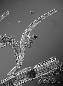 Spirostomum is a genus of ciliated protists in the class Heterotrichea. It is known for being very contractile.[5] Having been first identified by Christian Gottfried Ehrenberg in 1834, further research has identified eight additional true morphospecies.[6][7][1] This bacterivore genus mainly lives in the sediment deposits at the bottom of various aquatic habitats, and members possess rquA genes that could be responsible for their ability to survive in these hypoxic and anoxic environments.[2][3][4][8] They are identifiable by their relatively (to other ciliates) large tubular/flat vermiform bodies.[5][6][1] Their life cycle consists of a growth stage, in which they mature, and asexual and sexual reproduction stages.[6] Some species are model organisms for studies on human pathogenic bacteria, while others are sensitive and accurate bioindicators for toxic substances.[2]