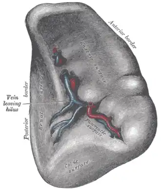 Near the middle of the spleen is a long fissure, the hilum, which is the point of attachment for the gastrosplenic ligament and the point of insertion for the splenic artery and splenic vein. There are other openings present for lymphatic vessels and nerves. In addition to the splenic artery, collateral blood supply is provided by the adjacent short gastric arteries.[14]